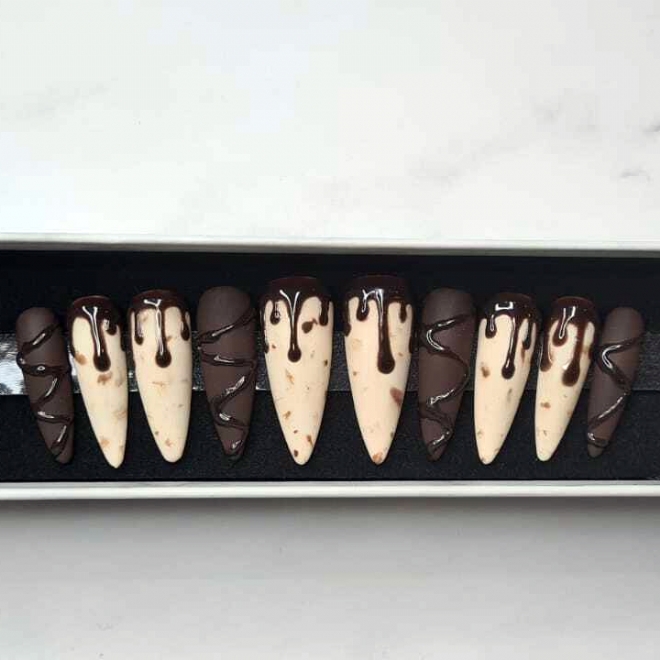 Ben jij een Chocolate Lover dan kun je deze set niet aan je voorbij laten gaan. de bijzondere 3D technieken maken dit setje helemaal af. Ga jij dit setje dragen, dan heb je echte blijkvangers! Het setje betreft een Stiletto vorm maar is ook te maken in Coffin, Almond of Shortie. Ze worden op maat gemaakt, dus wij neme contact op voor de juiste afmetingen.